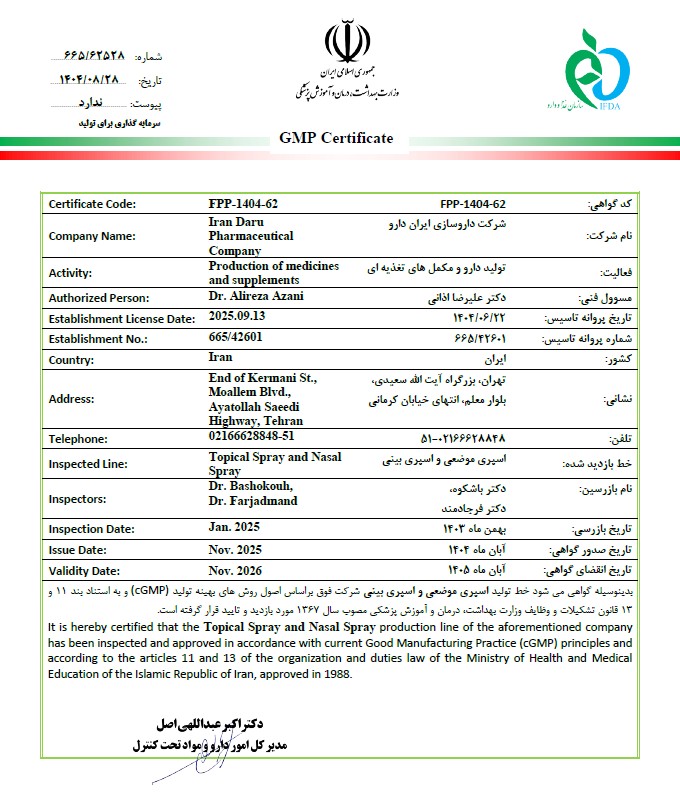 با تلاش متخصصان شرکت ایران دارو ، این شرکت موفق به دریافت گواهینامه GMP برای خط تولید اسپری موضعی و اسپری بینی از سازمان غذا و دارو گردید.